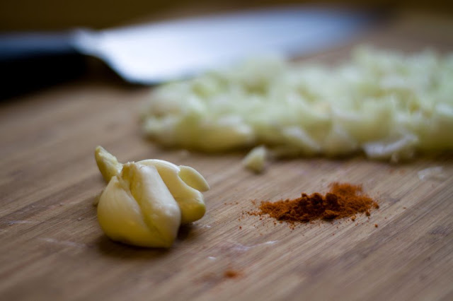 Once they're softened add all the spices to your tastes. I did a tsp of turmeric, ginger, salt, and a 1/2 tsp of chili flakes. Also add the tomato paste and a cup of boiling water.